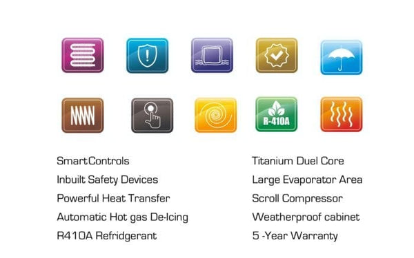 Features of the Waterco XL Inverter Heat pump are, smart controls, Titanium Dual Core, Scroll Compressor, 5 years warranty, powerful Heat Transfer.